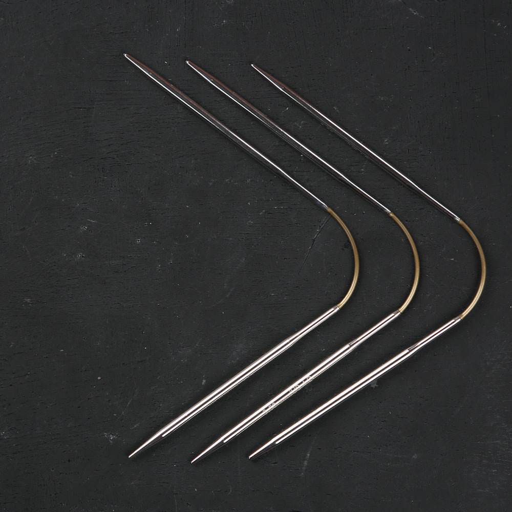 This is possible due to the special flexibility of the middle section of the needle, which enables it to fit every hand. When knitting in rounds, the stitches are distributed across two needles are simply knitted with the third needle. So only two needle changes are needed per round. Individual needles can also be used as cable needles.